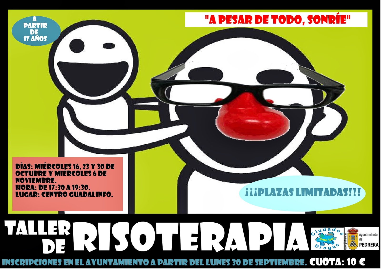 "A pesar de todo, sonríe". Plantemos cara a la crisis, al día a día, a los problemas...con la mejor arma que tenemos, LA RISA. Desde el programa "Pedrera ante las drogas" proponemos este taller vivencial en el que mediante actividades participativas y atractivas de cohesión grupal, juegos, música y baile, se intenta hacer aflorar la risa del niño/a que llevamos dentro. Se trata de convertirnos en niños/as por un rato y dejar aflorar la risa más genuina mediante la creación de un ambiente de confianza y complicidad. Consiste en proponer variedad de alternativas para despertar lo mejor de cada uno/a, sumergirnos en el mundo de los sentidos, la comunicación más primitiva y hacernos sentir más vivos/as, más plenos/as, más humanos/as.